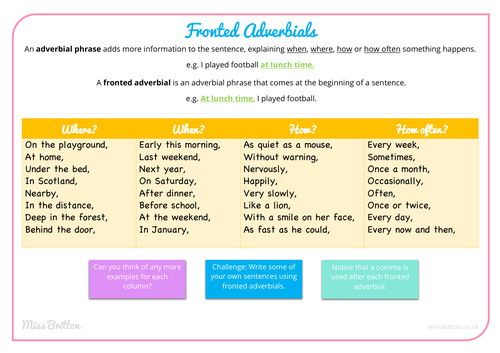 Aim Success Criteria I Can Recognise And Use Fronted Adverbials Ppt Download from slideplayer.com There are 3 main types of adverbial phrases: What is a fronted adverbial? When words that set the scene for the main part of the sentence appear at the front of the sentence, it is usual to follow them. While a standard sentence consists of subject + verb + predicate, variations on this are possible. Earlier today, i discovered fronted adverbials. When a fronted adverbial is used, a comma is usually placed after it. An adverb phrase that answers the question when? is called a temporal adverbial. In other words, fronted adverbials are words or phrases at the beginning of a sentence children are taught what a fronted adverbial is and how to use it correctly in their writing in year 4.